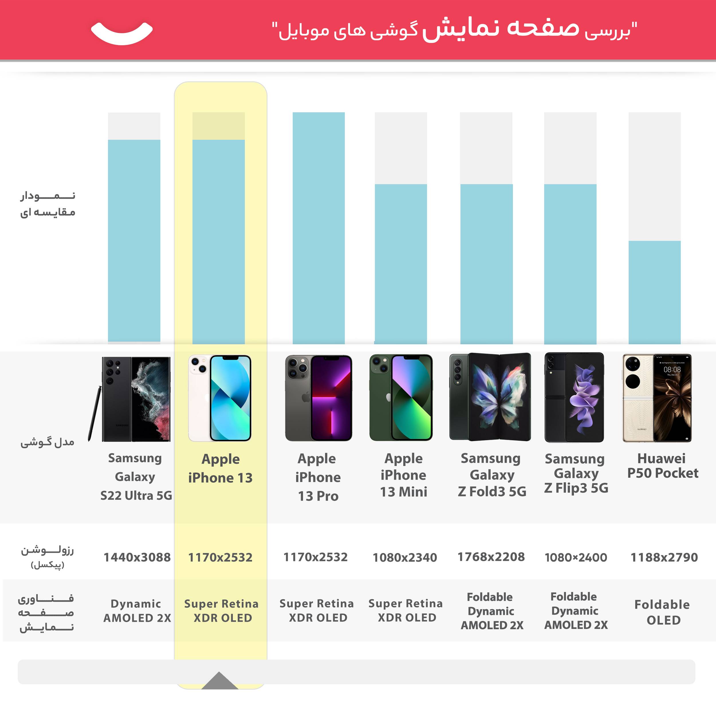 همانطور که میدانیم، صفحاتنمایش دو مدل آیفون 13 پرو و 13 پرو مکس توانایی ارائه اولین نرخ بروزرسانی 120 هرتز را دارند. این اولین بار در تاریخ گوشیهای هوشمند اپل است که چنین صفحهنمایشی را شاهد هستیم. اما آیفون 13 و آیفون 13 مینی همانند پرچمداران نسلهای قبلی، توانایی ارائه نرخ بروزرسانی 60 هرتز را دارند. از نظر میزان روشنایی هم این صفحهنمایش توانایی ارائه حداکثر روشنایی 1200 نیت (شمع در متر مربع) را دارد. بهره بردن از چنین میزان روشنایی سبب شده تا در شرایط نوری متنوع و حتی تابش مستقیم نور خورشید هم شاهد وضوح تصویر بسیار بالا و باکیفیتی از صفحهنمایش آیفون 13 باشیم.
