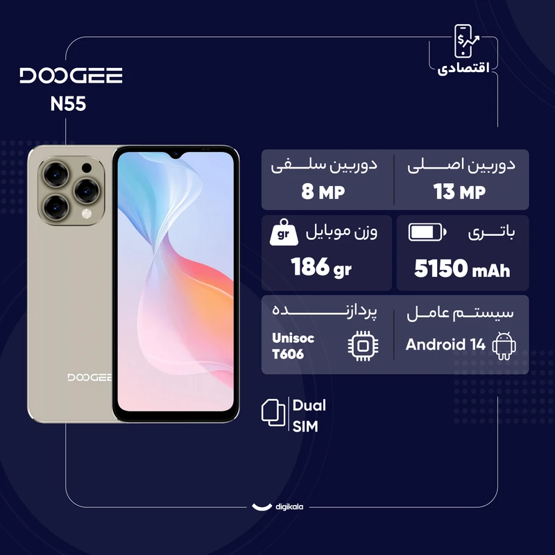 گوشی Doogee N55 در سال 2024 معرفی شد و با طراحی ساده و مشخصات کاربردی خود توانسته توجههای زیادی را در بازار گوشیهای اقتصادی به خود جلب کند. این گوشی با وزن 186 گرم و ضخامت 8.6 میلیمتر، خوشدست و مناسب استفاده روزمره است. صفحهنمایش 6.56 اینچی IPS LCD با نرخ نوسازی 90 هرتز تجربهای روان ارائه میدهد .این صفحه نمایش دارای روشنایی 350 نیتی، تراکم پیکسلی 269 و رزولوشن 720 در 1612 است. Doogee N55 به چیپست Unisoc T606 مجهز شده است که با 4 گیگابایت رم و 128 گیگابایت حافظه داخلی همراه است. این ترکیب برای کارهای معمولی مثل وبگردی، تماشای ویدیو و شبکههای اجتماعی عملکرد خوبی دارد. البته نکته مثبت این گوشی، پشتیبانی از کارت حافظه جانبی است. دوربین 13 مگاپیکسلی این گوشی با قابلیت HDR و فلش دوگانه، برای ثبت لحظات روزمره مناسب است. دوربین سلفی 8 مگاپیکسلی هم عملکردی رضایتبخش در تماسهای ویدیویی و عکسهای سلفی دارد. یکی دیگر از نقاط قوت این گوشی باتری 5150 میلیآمپرساعتی است که با یک بار شارژ تا یک روز کامل دوام میآورد. این باتری با توان 10 وات شارژ میشود. در مجموع، Doogee N55 با قیمت مناسب، باتری قوی و سیستمعامل اندروید 14، یک گزینهای مقرون به صرفه برای کاربران سادهپسند و کسانی است که به دنبال گوشیای با قیمت مناسب هستند.