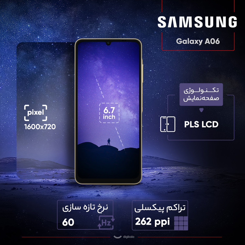 Samsung Galaxy A06 به یک نمایشگر 6.7 اینچی PLS LCD مجهز شده است که رزولوشن 720x1600 پیکسل را ارائه میدهد. این صفحهنمایش با نسبت تصویر 20:9 و تراکم پیکسلی ~262 پیکسل در هر اینچ، تجربه بصری قابل قبولی را برای کاربران فراهم میکند. میزان روشنایی صفحه مناسب است، اما در زیر نور مستقیم خورشید ممکن است خوانایی آن کمی کاهش یابد. نرخ نوسازی 60 هرتز برای این دستگاه در نظر گرفته شده که برای کاربری روزمره کافی است اما در مقایسه با برخی رقبا، کمی قدیمی به نظر میرسد.