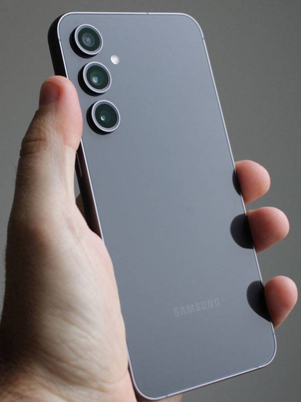 طراحی و ظاهر گوشی Galaxy A55، همان طراحی ساده و آشنای دو سال گذشته سامسونگ است و باید بگوییم هیچ شگفتانه خاصی در انتظار شما نخواهد بود. این گوشی دارای قاب پشتی از جنس شیشه است که ظاهر براق و زیبایی به آن داده است و در عین حال سبب شده به راحتی اثر انگشت و لکه روی آن قابل دیدن باشد. فریم این مدل آلومینیومی است که ظاهر شیکی دارد و آن را از نمونه ارزانتر سامسونگ A35 متمایز میکند. طراحی دوربین هم مانند گذشته به شکل سه جزیره مجزا به شکل ستونی است. تنها تفاوت شاید برآمدگی کوچکی باشد که در بخش قرارگیری کلیدهای روی وجه سمت راست گوشی باشد. شاید این تغییر کوچکی باشد، اما کاربری این کلیدها را به مراتب راحتتر کرده است. این گوشی همچنین دارای گواهی IP67 است که آن را در برابر نفوذ گرد و غبار و آب مقاوم میکند و با خیال راحتتری میتوانید با آن کار کنید. این گوشی با داشتن وزن ۲۱۳ گرم گوشی سبکی نیست اما وزنش از محدوده استاندارد هم فراتر نمیرود. همین موضوع را میتوان راجع به ضخامت ۸.۲ میلیمتری هم بیان کرد.