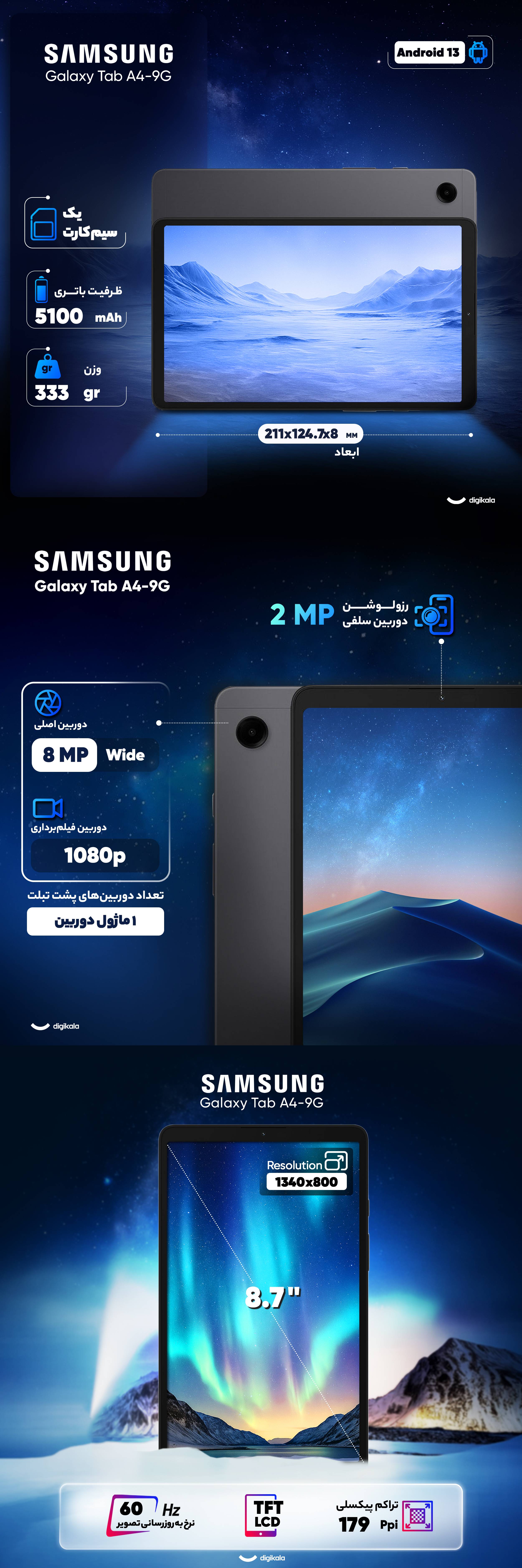 تبلت ۸.۷ اینچ سامسونگ مدل Galaxy Tab A9-4G ظرفیت 64 گیگابایت و رم 4 گیگابایت / پلمپ و آکبند