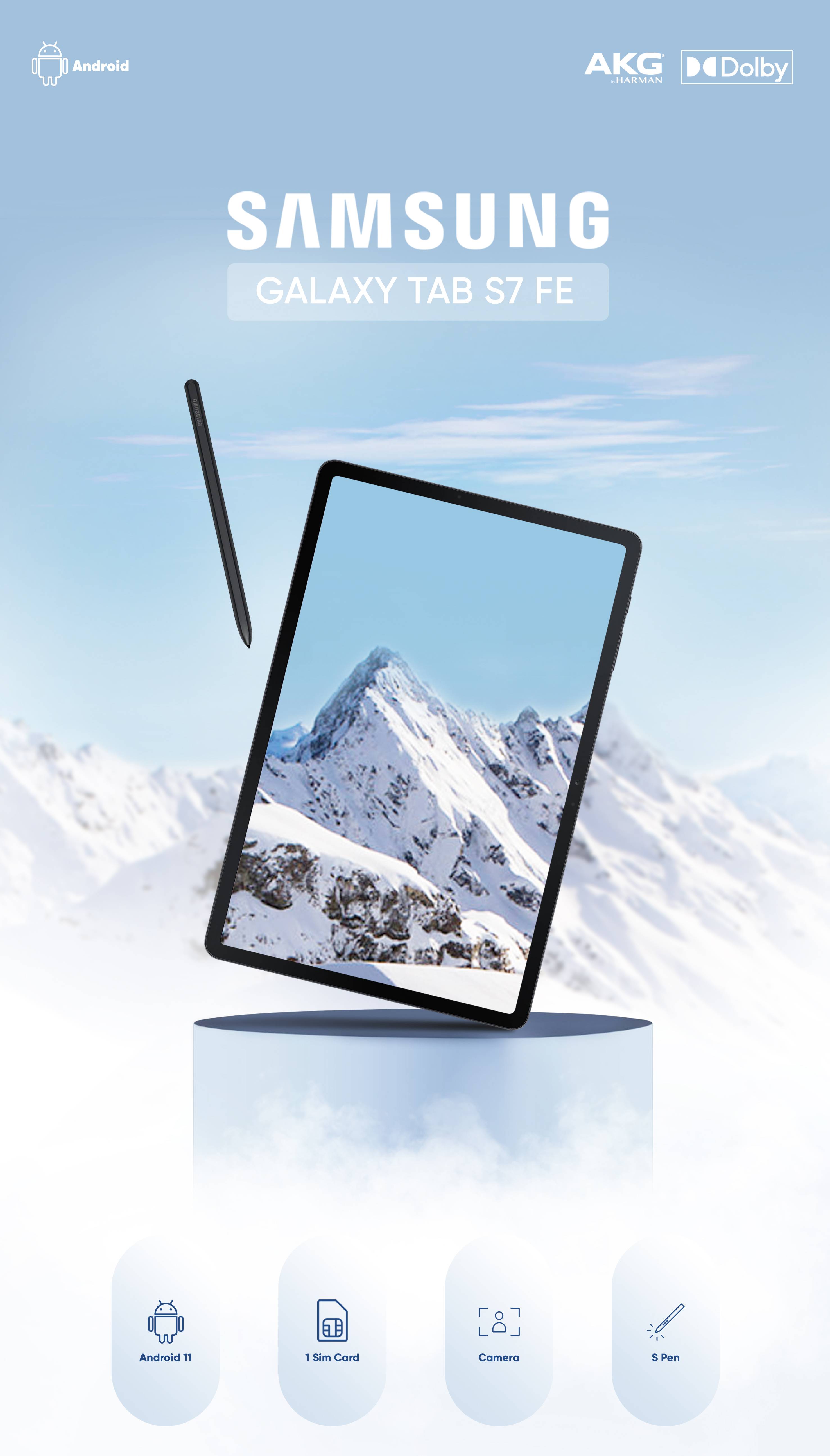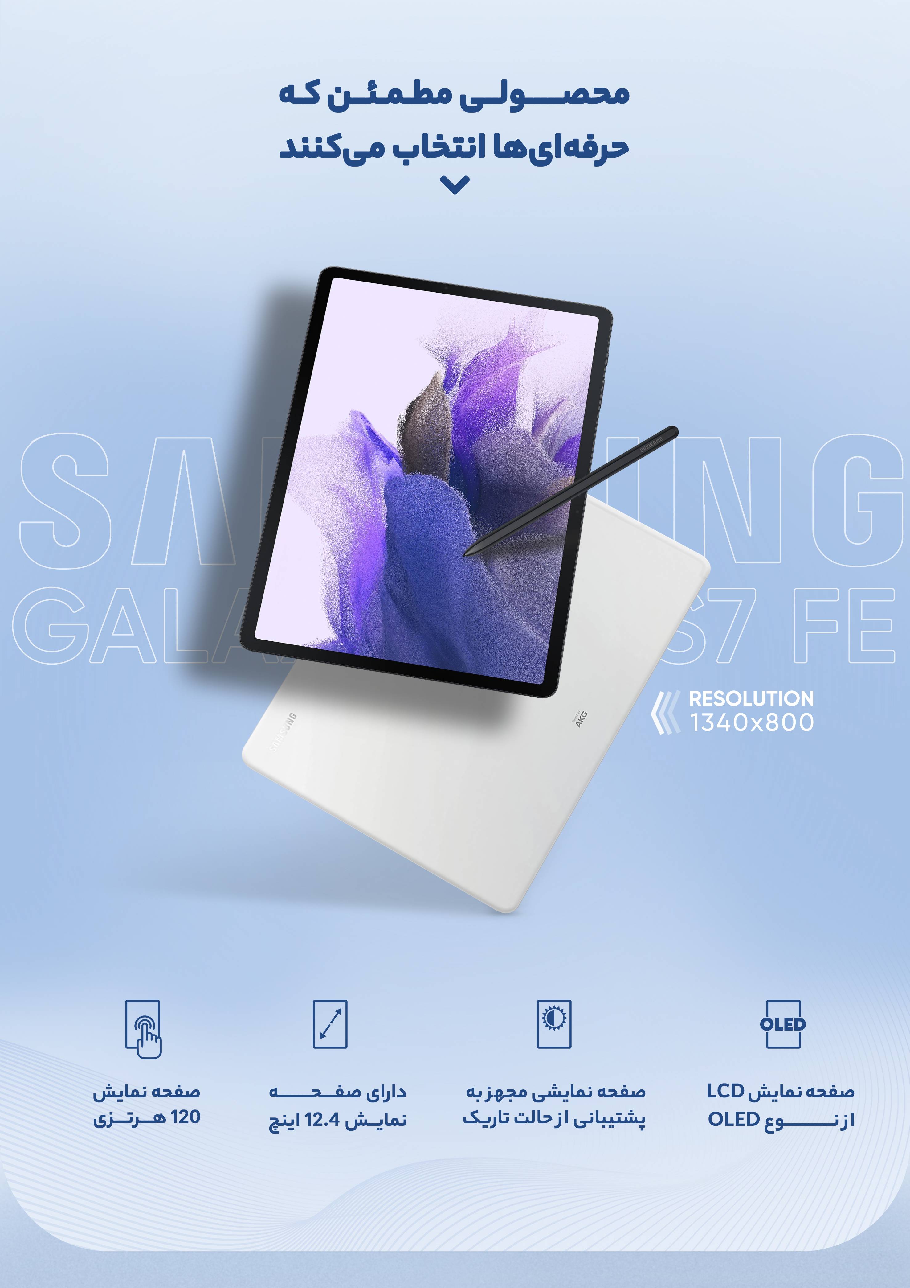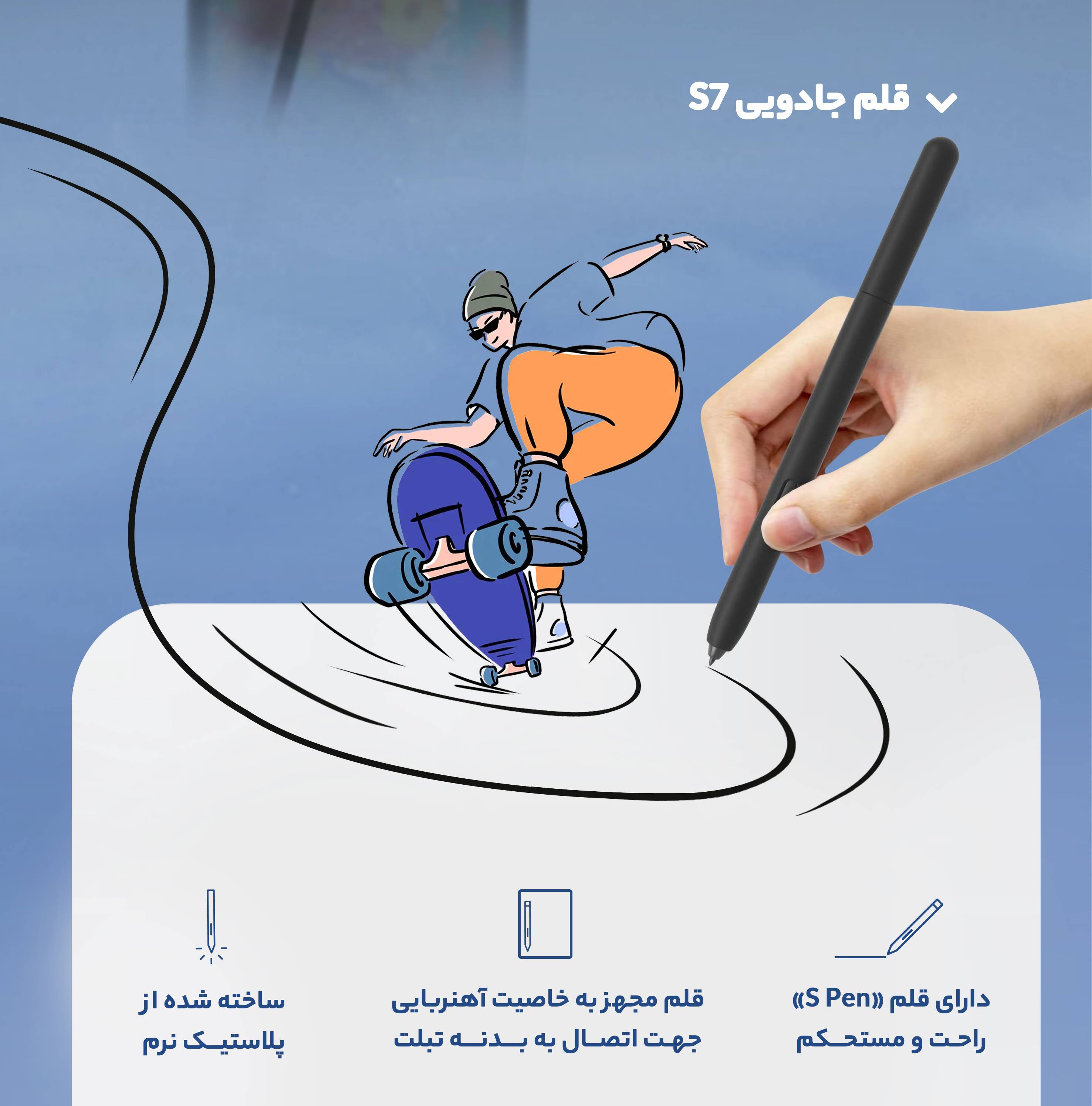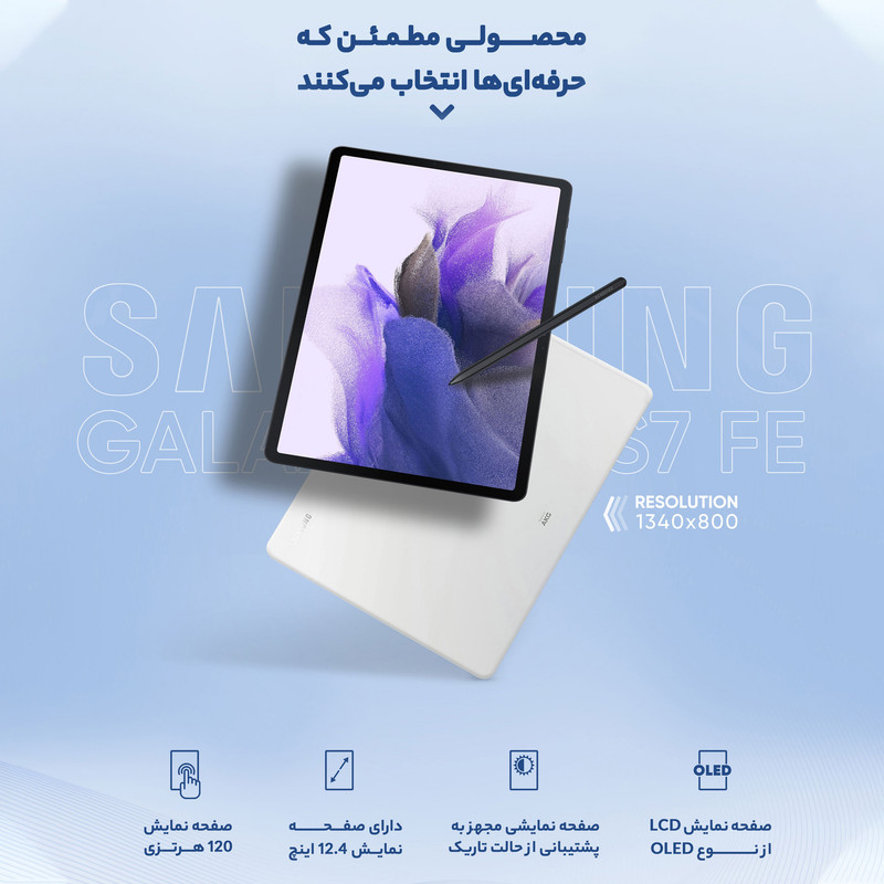 تبلت « Galaxy Tab S7 FE LTE » یکی از محصولات شرکت «سامسونگ» است که با سایز 12.4 اینچ روانه بازار شده است. صفحهنمایش این محصول از نوع TFT است و وضوح تصویر 2560×1600 پیکسل با تراکم 243 پیکسل بر اینچ را به تصویر میکشد. ظرفیت داخلی این تبلت 64 گیگابایت است و میتواند فضای مناسبی برای ذخیرهسازی حجم زیادی از فایلهای صوتی و تصویری، بازی و اپلیکیشنهای مختلف را در اختیار کاربران بگذارد، همچنین می توان این میزان را با استفاده از حافظه microSD افزایش داد. با توجه به پشتیبانی این محصول از یک سیمکارت میتوانید از آن برای اتصال به شبکههای ارتباطی 3G و 4G استفاده کنید. سنسور دوربین اصلی این محصول 8 مگاپیکسل است. دوربین سلفی که از سنسوری 5 مگاپیکسلی بهره برده، میتواند برای برقراری ارتباطات ویدئویی بسیار کارآمد باشد. سیستمعامل نسخهی 11 اندروید و رابط کاربری One UI 3.1 به صورت پیشفرض در این محصول ایفای نقش میکند. یک باتری غیر قابل تعویض 10090 میلیآمپرساعتی، با قابلیت شارژ سریع وظیفهی تأمین انرژی آن را به عهده دارد.