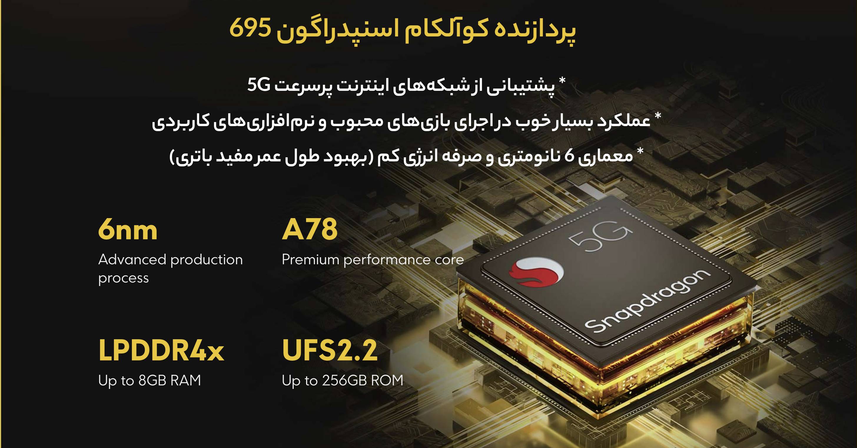 | تراشه | Qualcomm SM6375 Snapdragon 695 5G (6 nm) |