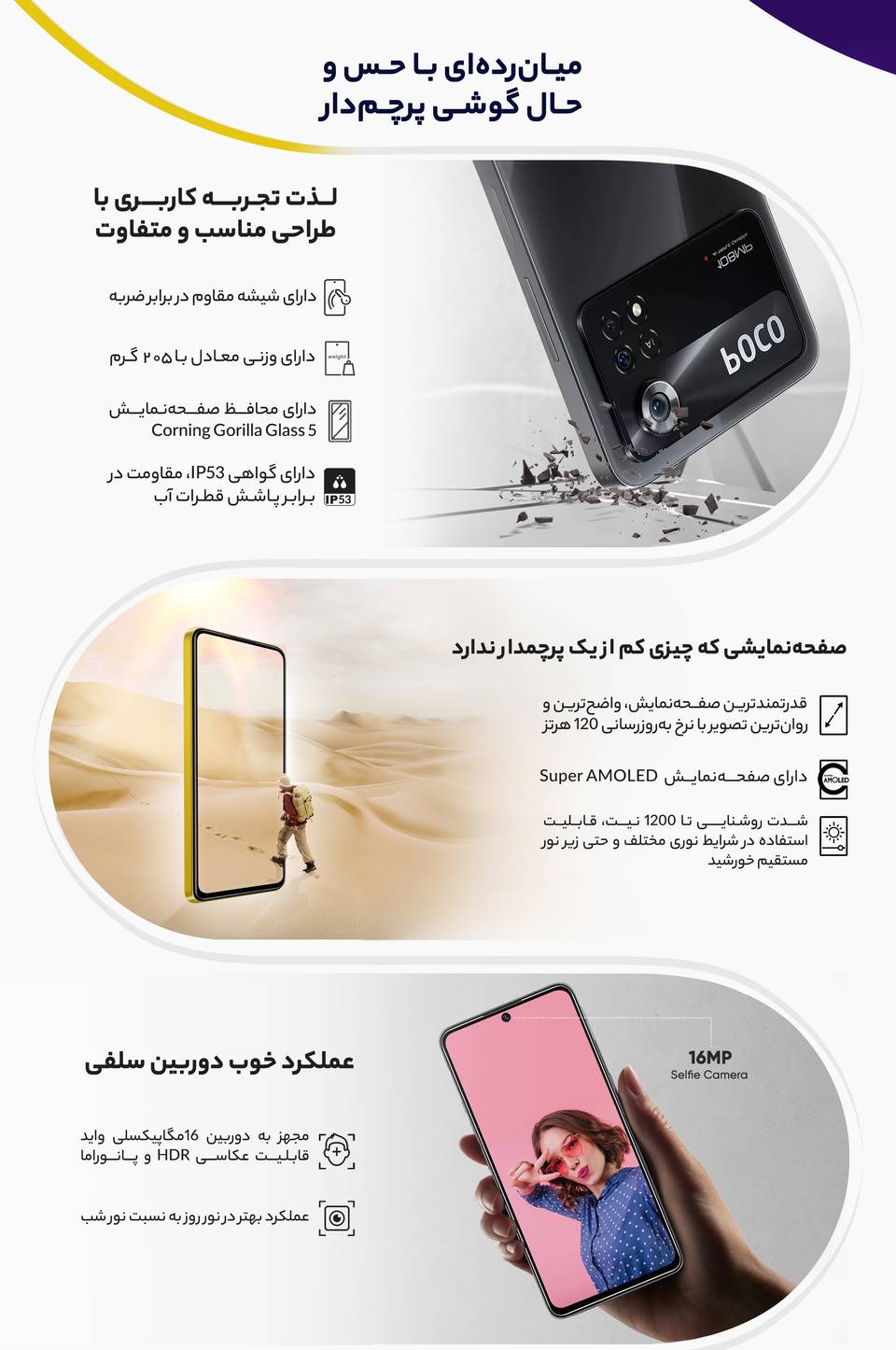 سری پوکو گوشیهای هوشمند میانرده شرکت شیائومی با توجه به قیمت در نظر گرفته شده به مشخصات فنی مناسب و کاملا قابل قبولی مجهز شدهاند و در بین کاربران محبوبیت بالایی دارند. یکی از گوشیهای میانرده و باکیفیت این سری، شیائومی Poco X4 Pro 5G است که در جایگاه یک گوشی میانرده به مشخصات فنی مناسبی مجهز شده است. در نمای روبهرویی این گوشی از صفحهنمایش با ابعاد 6.67 اینچ و رزولوشن 1080×2400 پیکسل از نوع سوپر امولد بهره برده است. این صفحهنمایش با توجه به توانایی نمایش 395 پیکسل در هر اینچ و نرخ بروزرسانی 120 هرتز، عملکرد بسیار خوب و باکیفیتی را بهشما ارائه میکند. در قسمت پشتی یک سنسور دوربین اصلی قدرتمند با رزولوشن 108 مگاپیکسل از نوع عریض در کنار سنسور 8 مگاپیکسلی از نوع فوق عریض (ultrawide) و سنسور 2 مگاپیکسل ماکرو، سنسورهای دروبین سهگانه Poco X4 Pro 5G را تشکیل میدهند. برای دوربین سلفی هم سنسور با رزولوشن 16 مگاپیکسل در نظر گرفته شده است. در بخش مشخصات سختافزاری هم حضور پردازنده اسنپدراگون 695 5G شرکت کوالکام سبب شده تا این گوشی عملکرد قابل قبولی را در اجرای بازیهای حتی سنگین همانند آسفالت 9 داشته باشد. البته نباید فراموش کنیم که به لطف حضور این پردازنده، Poco X4 Pro 5G توانایی پشتیبانی از شبکههای اینترنتی پرسرعت نسل پنجم یا همان 5G را هم دارد. باتری قدرتمند با میزان ظرفیت 5000 میلیآمپرساعت در کنار شارژر 67 وات مجهز به تکنولوژی شارز سریع (توانایی شارژ صفر تا صد درصدی در مدت زمان 41 دقیقه) از دیگر مشخصات در نظر گرفته شده برای این گوشی هوشمند میانرده هستند.