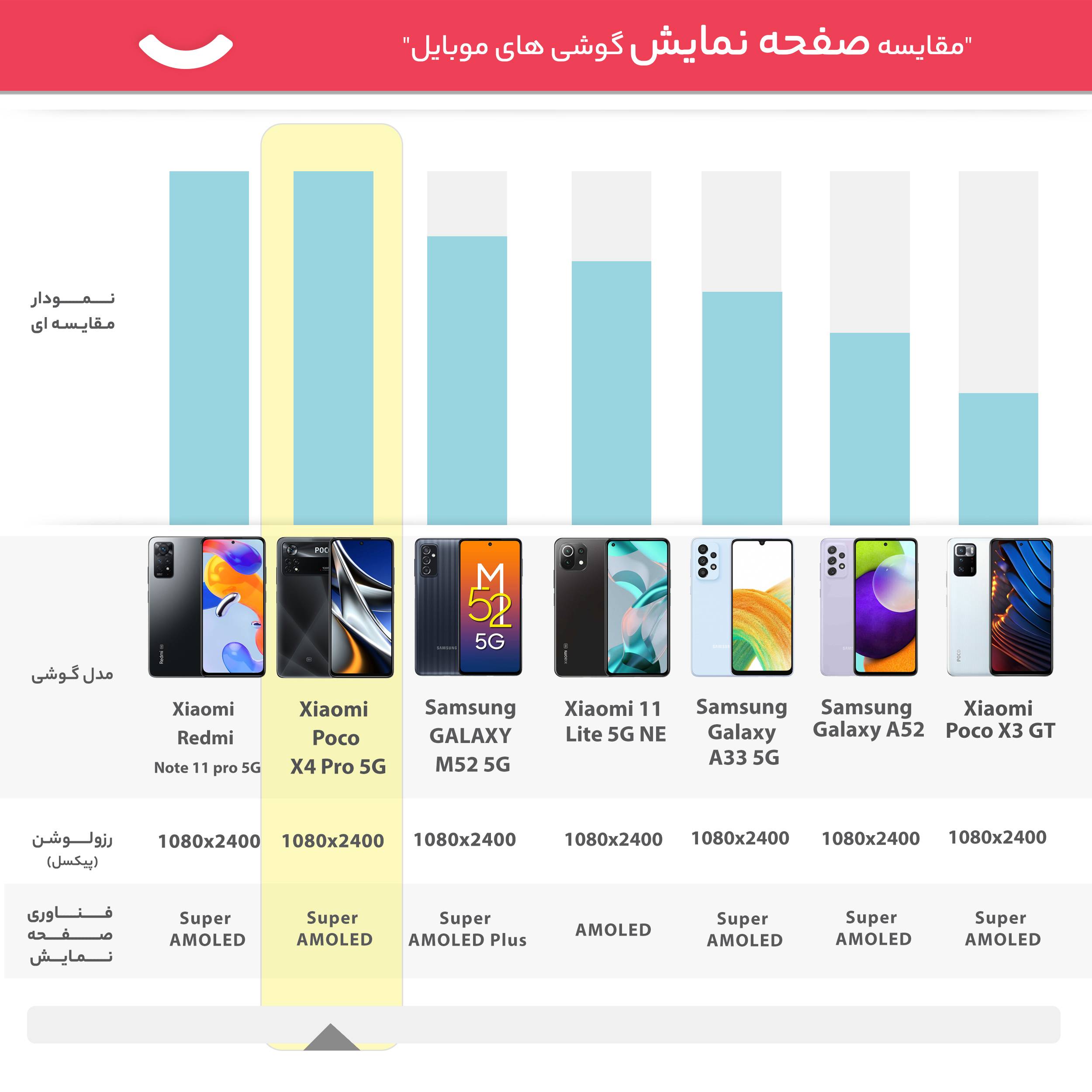 در این بخش هم شیائومی Poco X4 Pro به نسبت نسل قبلی یعنی Poco X3 Pro، عملکرد بهتری دارد. این گوشی به صفحهنمایش با ابعاد ۶.۶۷ اینچ و رزولوشن ۱۰۸۰×۲۴۰۰ پیکسل از نوع امولد مجهز شده است. حضور پنل امولد سبب شده تا کیفیت بهتری را به نسبت پنل IPS در گوشیهای هوشمند دیگر شاهد باشید و از طرفی مصرف انرژی کمتری هم دارد. اما یکی دیگر از معیارهای یک صفحهنمایش باکیفیت، میزان نرخ بروزرسانی در نظر گرفته شده است.