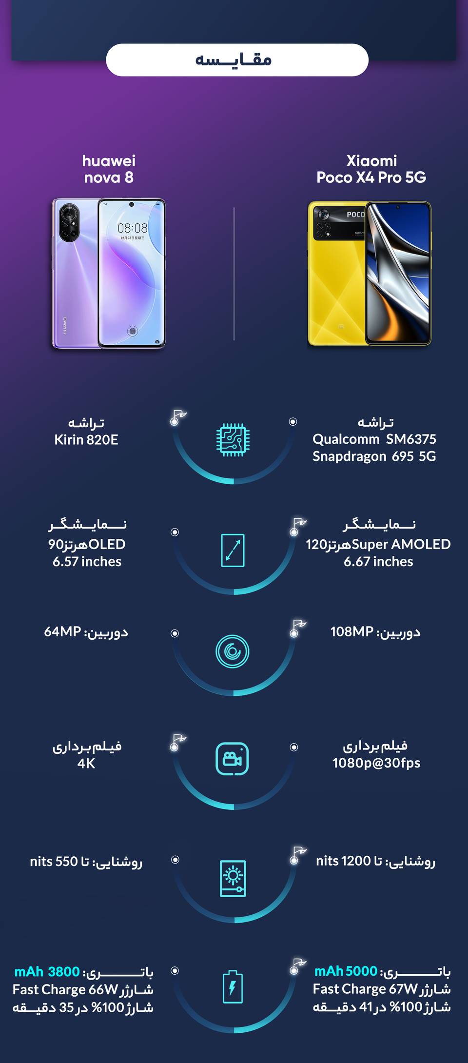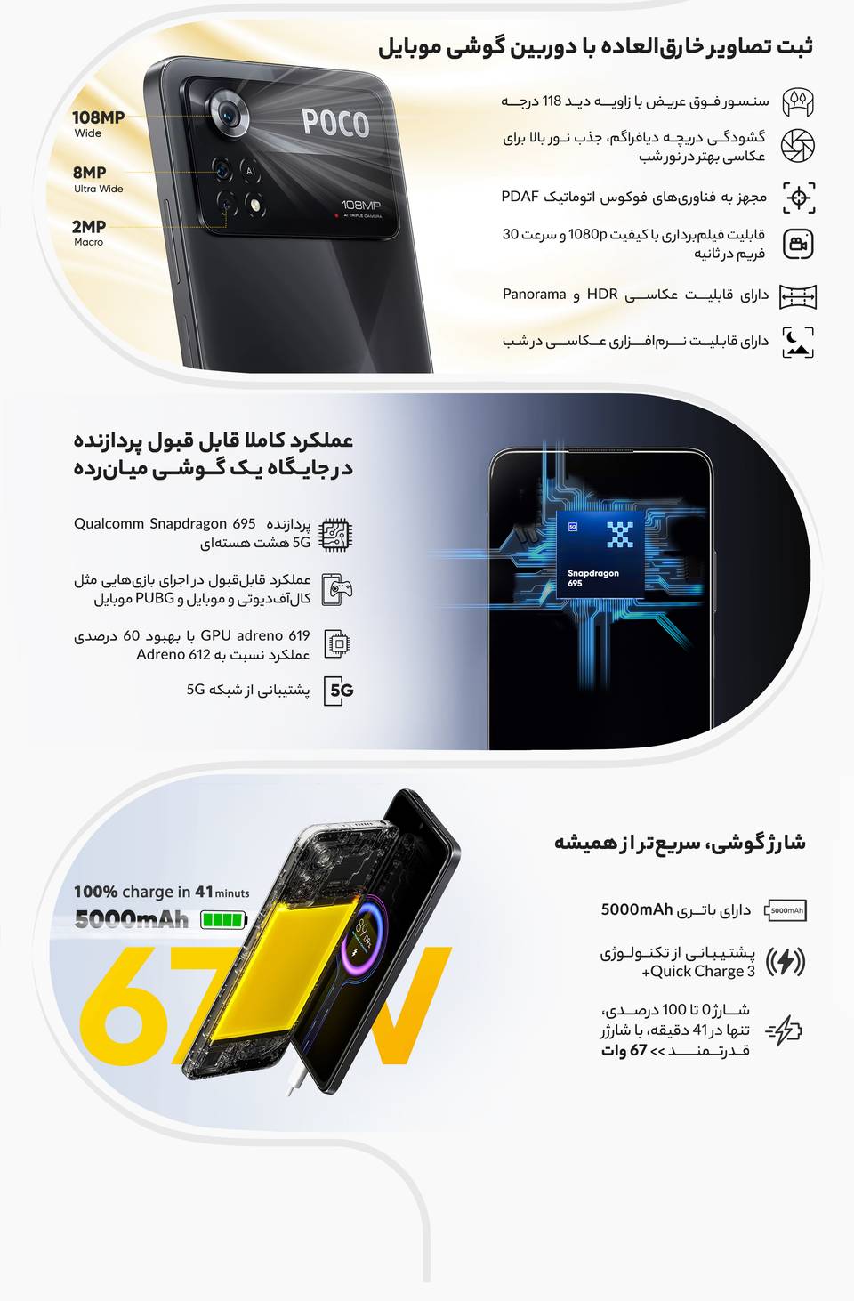 شیائومی Poco X3 Pro به عنوان گوشی میانرده نسل قبلی Poco X4 Pro، در زمینه پردازنده و سختافزار عملکرد فوق العادهای در حد و اندازه یک گوشی پرچمدار داشته است. Poco X4 Pro هم در این بخش به پردازنده اسنپدراگون 695 5G شرکت کوالکام مجهز شده است که این پردازنده عملکرد بسیار خوبی در اجرای بازی دارد و البته نباید فراموش کنیم که این پردازنده سبب شده تا شیائومی Poco X4 Pro، توانایی پشتیبانی از شبکههای اینترنتی نسل پنجم یا همان 5G را هم داشته باشد. در بخش مشخصات سختافزار میتوانیم به باتری مناسب با میزان ظرفیت ۵۰۰۰ میلیآمپرساعت اشاره کنیم که این باتری به ازای هر بار شارژ صد درصدی، توانایی ارائه طول عمر مفید (زمان آماده بهکار) دو روز را در شرایط استفاده معمولی دارد. شارژر بسیار قدرتمند با توان ۶۷ وات در نظر گرفته شده برای این گوشی هوشمند میانرده که از فناوری شارژ سریع هم پشتیبانی میکند، توانایی شارژ صفر تا صد درصدی باتری را در مدت زمان کوتاه ۴۱ دقیقهای دارد.