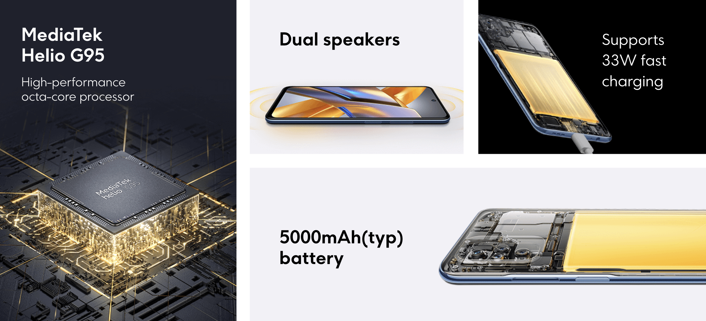 شیائومی Poco M5s به پردازنده هلیو G95 شرکت مدیاتک مجهز شده است. دو هسته قدرتمندتر با توانایی ارائه حداکثر فرکانس کاری ۲.۰۵ گیگاهرتز در کنار شش هسته اقتصادی با صرفه انرژی کمتر و توانایی ارائه فرکانس کاری ۲.۰ گیگاهرتز، هشت هسته این پردازنده را تشکیل میدهند. با توجه به این مشخصات، باید بگوییم که Poco M5s توانایی اجرای بازیهای سنگین و با گرافیک بالایی مثل کالآفدیوتی موبایل، آسفالت ۹ و PUBG موبایل را هم دارد. اما بهتر است برای اجرای چنین بازیهایی، تنظیمات گرافیکی بازی را روی حالت low قرار دهید تا عملکردی روان و بدون لگ را شاهد باشید. باتری با میزان ظرفیت ۵۰۰۰ میلیآمپرساعت هم سبب شده تا به ازای هر بار شارژ صد درصدی، طول عمر مفید (زمان آماده بهکار) دو روز را در مصرف عادی داشته باشد. البته پشتیبانی از فناوری شارژ سریع ۳۳ واتی هم سبب شده تا زمان زیادی را صرف شارژ گوشی نکنید و در مدت زمان ۳۰ دقیقه امکان شارژ صفر تا ۶۴ درصدی وجود دارد.