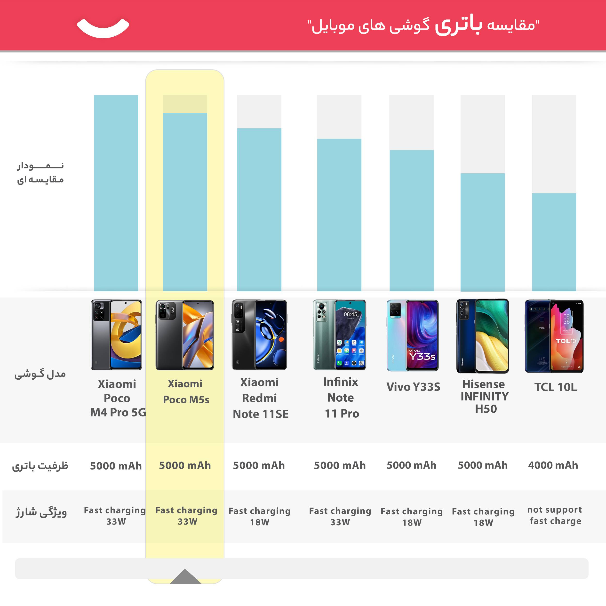 سری Poco گوشیهای هوشمند شیائومی را باید یکی از موفقترین سریهای میانرده این شرکت دانست که با بهره بردن از مشخصات فنی مناسب، عملکرد بسیار خوبی را بهنمایش گذاشتهاند. شیائومی Poco M5s هم یکی از این گوشیهای میانرده است که به نسبت قیمت در نظر گرفته شده، از مشخصات فنی مناسب و قابل قبولی بهره برده است. در نمای روبهرویی این گوشی به صفحهنمایش با ابعاد 6.43 اینچ و رزولوشن 1080×2400 پیکسل از نوع امولد مجهز شده است. صفحهنمایشی که از جمله قابلیتهای قدرتمند آن میتوانیم به نمایش 409 پیکسل در هر اینچ و حداکثر روشنایی 1100 نیت (شمع در متر مربع) اشاره کنیم. برای طراحی صفحهنمایش هم از ناچ اینفینیتی O استفاده شده است که بریدگی دایرهای شکل ناچ در قسمت بالایی و مرکزی صفحهنمایش، سنسور دروبین سلفی با رزولوشن 13 مگاپیکسل را در خود جای داده است. در قسمت پشتی هم یک سنسور دوربین اصلی با رزولوشن 64 مگاپیکسل از نوع عریض (wide) در کنار سنسور 8 مگاپیکسل از نوع فوق عریض (ultrawide) و دو سنسور با رزولوشن 2 مگاپیکسل از نوع سنجش عمق و ماکرو، سنسورهای دوربین چهارگانه این گوشی هوشمند را تشکیل میدهند. در بخش مشخصات سختافزاری هم حضور پردازنده هلیو G95 شرکت مدیاتک سبب شده تا Poco M5s توانای ارائه عملکرد قابل قبولی در اجرای بازیهای محبوب و نرمافزارهای کاربردی داشته باشد. در نهایت میرسیم به باتری که با میزان ظرفیت 5000 میلیآمپرساعتی، توانایی ارائه طول عمر مفید (زمان آماده بهکار) دو روز را در مصرف عادی دارد. پشتیبانی از فناوری شارژ سریع 33 وات هم سبب شده تا امکان شارژ صفر تا 64 درصدی این باتری در مدت زمان 30 دقیقه وجود داشته باشد.