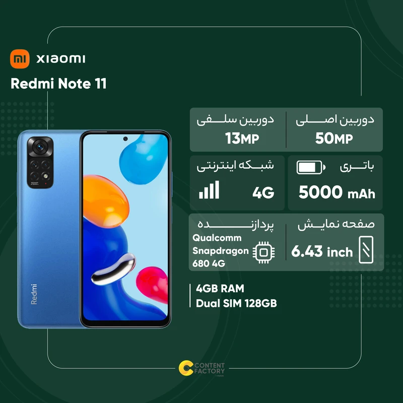 شیائومی Redmi Note 11 به عنوان یکی از گوشیهای هوشمند میانرده بسیار باکیفیت این شرکت شناخته میشود که به لطف بهره بردن از مشخصات فنی مناسب، توانایی ارائه عملکرد بسیار خوب و قابل قبولی را در جایگاه یک گوشی هوشمند میانرده دارد. در نمای روبهرویی این گوشی به صفحهنمایش با ابعاد 6.43 اینچ و رزولوشن 1080×2400 پیکسل از نوع امولد مجهز شده است. صفحهنمایش بسیار باکیفیت که توانایی ارائه نرخ بروزرسانی 90 هرتز را هم دارد. در قسمت پشتی هم چهار سنسور دوربین برای این گوشی هوشمند میانرده در نظر گرفته شده است. یک سنسور دروبین اصلی با رزولوشن 50 مگاپیکسل از نوع عریض در کنار سنسور 8 مگاپیکسل از نوع فوق عریض (ultrawide) و دو سنسور با رزولوشن 2 مگاپیکسل از نوع ماکرو و سنجش عمق، سنسورهای دروبین چهارگانه Redmi Note 11 را تشکیل میدهند. بریدگی دایرهای شکل ناچ در قسمت بالایی و مرکزی صفحهنمایش هم سنسور دوربین سلفی با رزولوشن 13 مگاپیکسل را در خود جای داده است. در بخش مشخصات سختافزاری هم شاهد حضور پردازنده میانرده اما قدرتمند اسنپدراگون 680 4G شرکت کوالکام هستیم که در اجرای بازی توانایی ارائه عملکرد بسیار خوب و قابل قبولی را دارد. باتری قدرتمند با میزان ظرفیت 5000 میلیآمپرساعت هم سبب شده تا به ازای هر بار شارژ صد درصدی، طول عمر مفید (زمان آماده بهکار) دو روز را در شرایط استفاده معمولی ارائه کند. شارژر قدرتمند با توان 33 وات مجهز به تکنولوژی شارژ سریع هم توانایی شارژ صفر تا صد درصدی باتری این گوشی را در مدت زمان 60 دقیقه را دارد.