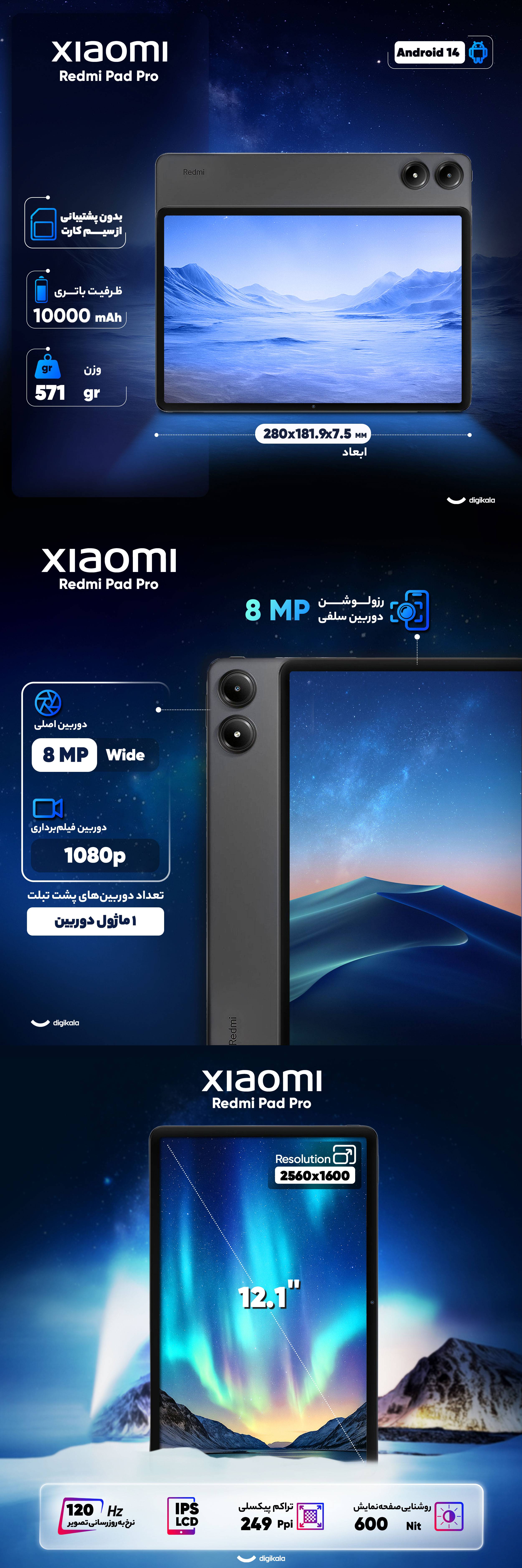 تبلت Xiaomi Redmi Pad Pro با نمایشگر بزرگ و روان، باتری غولآسا، سختافزار بهروز و پشتیبانی از قلم، انتخابی عالی برای کاربریهای چندرسانهای، آموزش و حتی سرگرمی محسوب میشود. هرچند عدم پشتیبانی از سیمکارت ممکن است محدودیتی برای برخی کاربران ایجاد کند، اما در عوض عملکرد سختافزاری قدرتمند، طراحی جذاب و امکانات نرمافزاری مدرن آن را به یکی از بهترین گزینهها در رده قیمتی میانرده تبدیل کرده است.