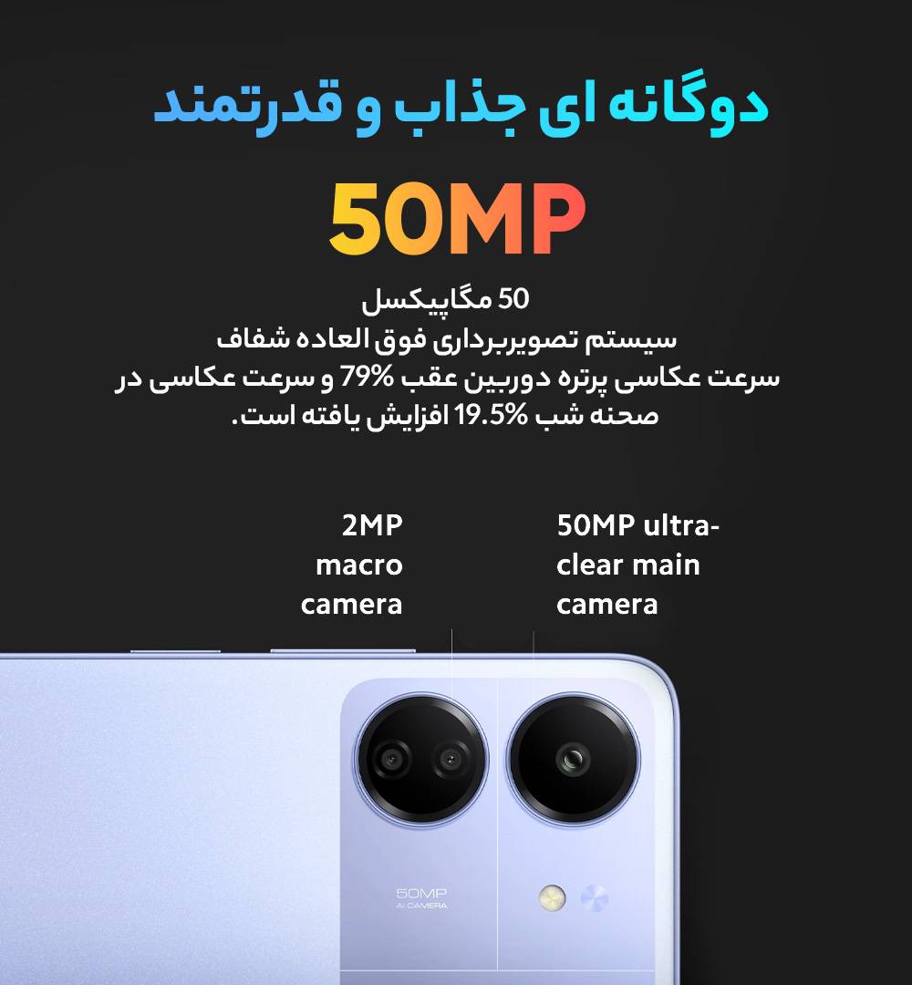 Poco C65 با دو حسگر دوربین، تجربهای عالی از عکاسی و فیلمبرداری را فراهم میکند. دوربین اصلی 50 مگاپیکسلی با لنز عریض و دریچه دیافراگم f/۱.۸، تصاویری با وضوح بالا و رنگهای طبیعی ثبت میکند. این دوربین قابلیتهای پیشرفتهای مانند عکاسی HDR و عکاسی پانوراما را نیز در اختیار کاربران قرار میدهد. در کنار دوربین اصلی، یک حسگر ماکرو دو مگاپیکسلی قرار دارد که برای عکاسی از سوژههای نزدیک و با جزئیات بالا مناسب است. فیلمبرداری با این گوشی در رزولوشن 1080p و با نرخ 30 فریم در ثانیه انجام میشود که برای کاربران عادی مناسب و کارآمد است. دوربین سلفی هشت مگاپیکسلی نیز با لنز عریض، عکسهای سلفی با کیفیت خوبی میگیرد و برای تماسهای تصویری نیز کارآمد است.